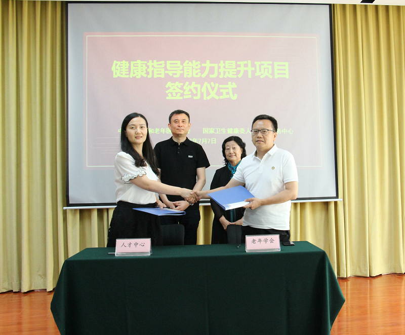 年)》、《“十四五”健康老龄化规划》相关工作任务和要求,坚持以覆盖全人群、全生命周期健康理念为中心,加强基层人民群众健康指导工作,中国老年学和老年医学学会(以下简称学会)和国家卫生健康委人才交流服务中心(以下简称人才中心)共同设立了健康指导能力提升项目。2022年7月7日,健康指导能力提升项目启动、研讨会暨合作签约仪式在京举行。学会会长刘维林、秘书长翟静娴,人才中心副主任方建宁、技能人才办公室刘清伟等相关负责人及项目办成员出席,会议由学会副秘书长张劲松主持。