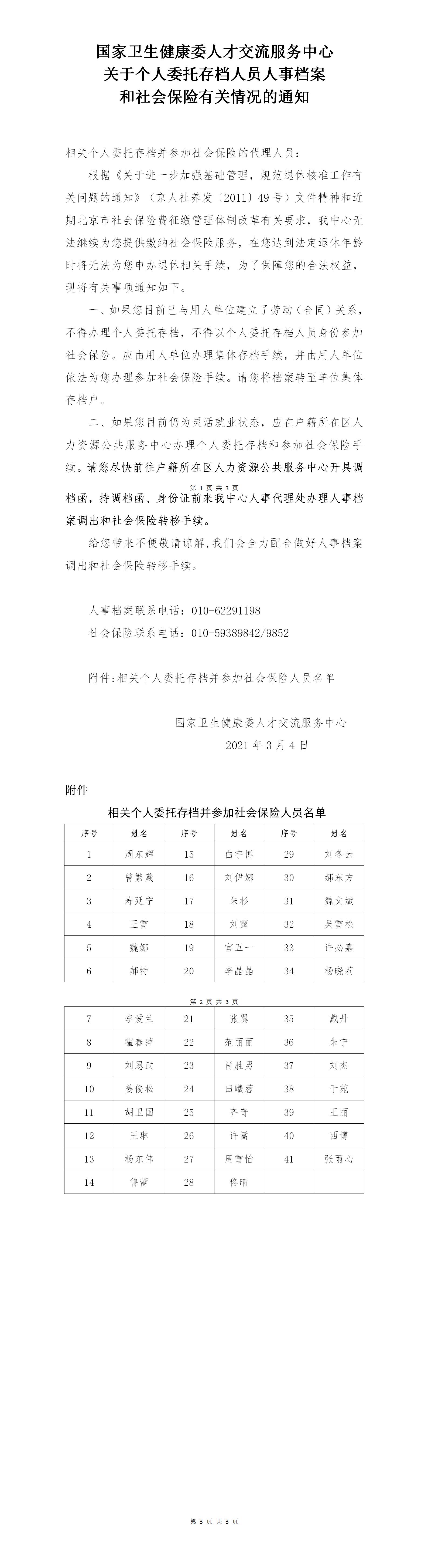 国家卫生健康委人才交流服务中心关于个人委托存档人员人事档案和社会保险有关情况的通知